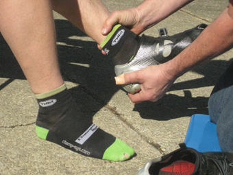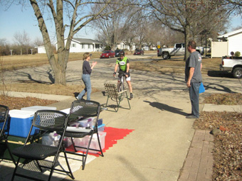 | Here he comes! The crew has already set out the folding chair, and while one crew member (Lisa) gets ready to take Keith's bike, another (Dick) is ready to help Keith take his shoes off. |