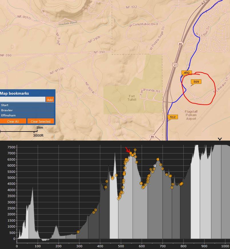Around 12:00 noon RAAM time, Keith completed the stint of interstate and reached the EC Ryder RV at the specified location on the southern edge of Flagstaff. His arrival at this location is on target with the team's plan and is a stupendous accomplishment! He has just completed a grueling ride through the desert, followed by continuous climbing. (see the image below - the red arrow on the profile of the route below the map gives you an idea of the amount of climbing Keith did to get to this point.)