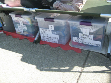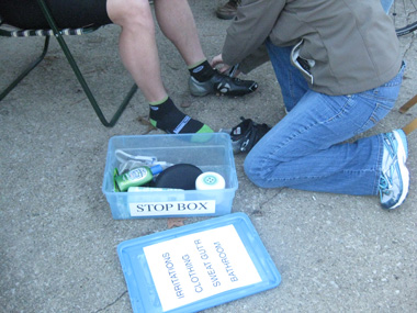 For the shorter daytime stops, a checklist of tasks shoud be completed in a short time period: one crew member takes the bike from Keith, while a second gets him seated in a chair and removes his shoes to administer a quick foot massage, and a third member ask Keiths about any trouble spots, skin irritations, bike problems, etc. The crew reminds him to eat something and records calorie intake. |