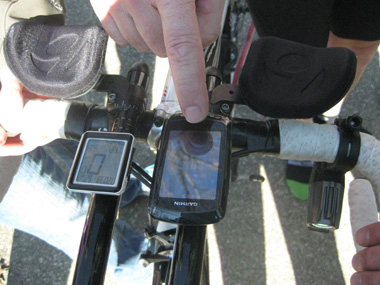 Keith explains the features of two onboard monitors planned for use on the bicycle -- one is a bike computer to provide information about each segment of the ride, and the other is GPS which will be pre-programmed with the RAAM course. It will be used as a supplemental information source since we cannot always rely on having a fully charged, fully functioning GPS unit on the bike. The primary responsibility for navigation will rest with the support crew. |