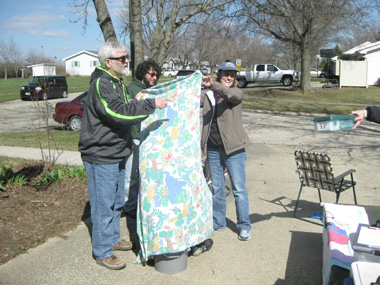 | The crew shields Keith during a "bathroom break." RAAM rules require avoidance of public nudity, so we have to plan for providing some sort of shelter when such a stop is required somewhere besides a service station, convenience store or other public restroom area. |