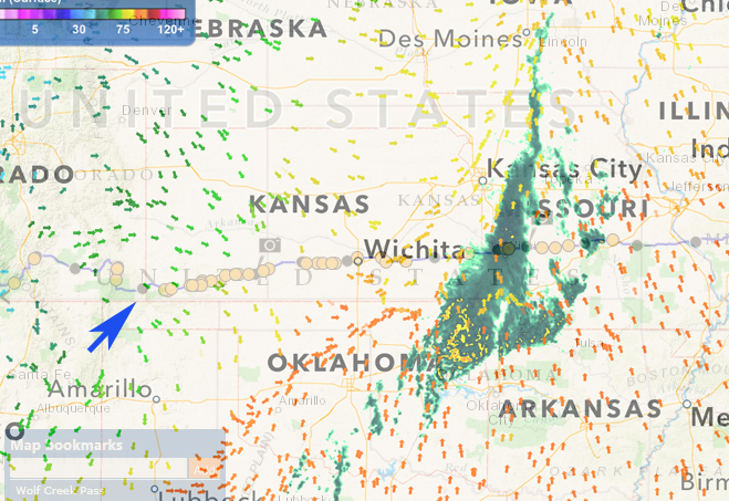 Today's ride is much different than anything Keith's been doing for the past several days -- that is, there are no steep climbs ahead for many miles. He'll be riding across Kansas, with a gentle push from a northwesterly wind -- at least in the morning hours. The weather service predicts that the winds in this region will shift in the afternoon.